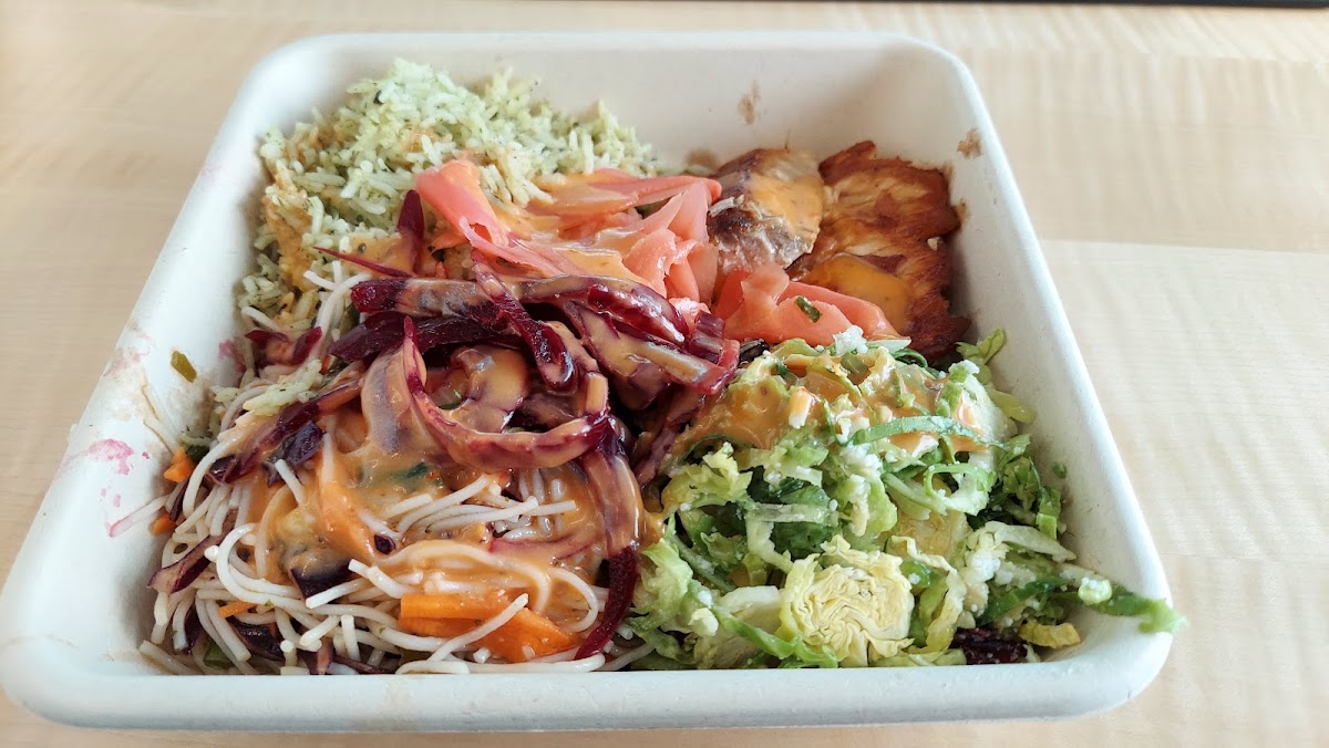 miso tofu, field greens, chipotle slaw, charred broccoli, miso dressing, and super seeds
