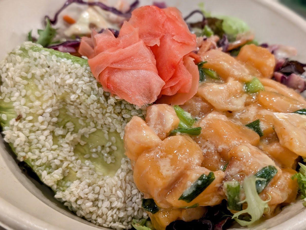 Salmon poke´ (raw), field greens, spicy cold noodles, sesame avocado, yuzu vinaigrette, and pickled ginger